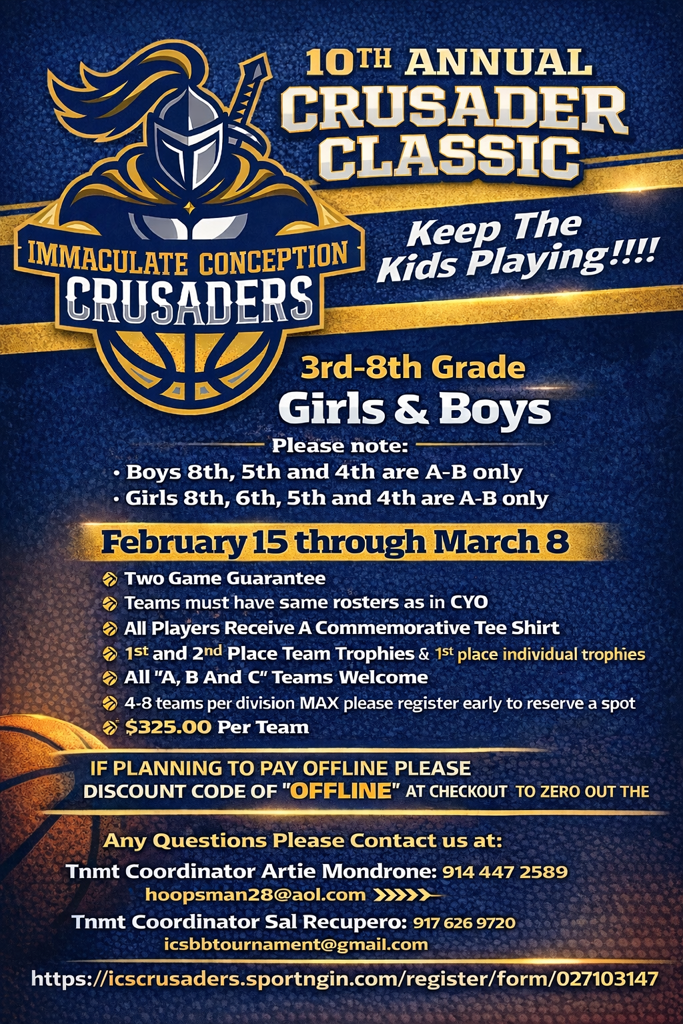 Welcome to the home of Immaculate Conception Crusaders Basketball. We are a parish based CYO basketball program open to boys and girls from 1st Grade to 12th Grade. The 3rd through 12th grade teams participate in Westchester/Putnam CYO league and the 1st and 2nd graders attend a basketball fundamentals clinic that will help them improve the skills they need to play.